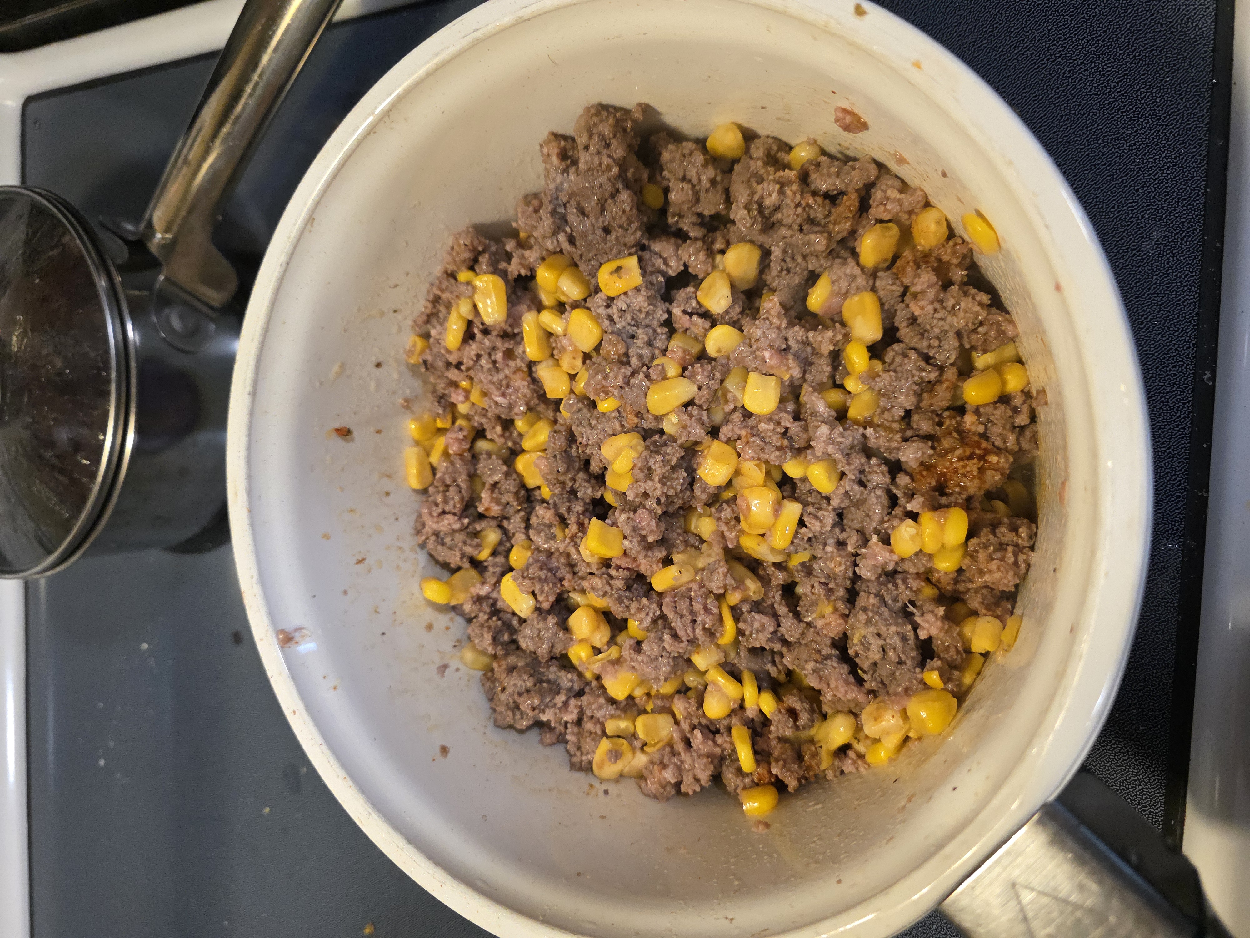 When the meat is all cooked, the water should be almost gone, add any desired veggies, frozen