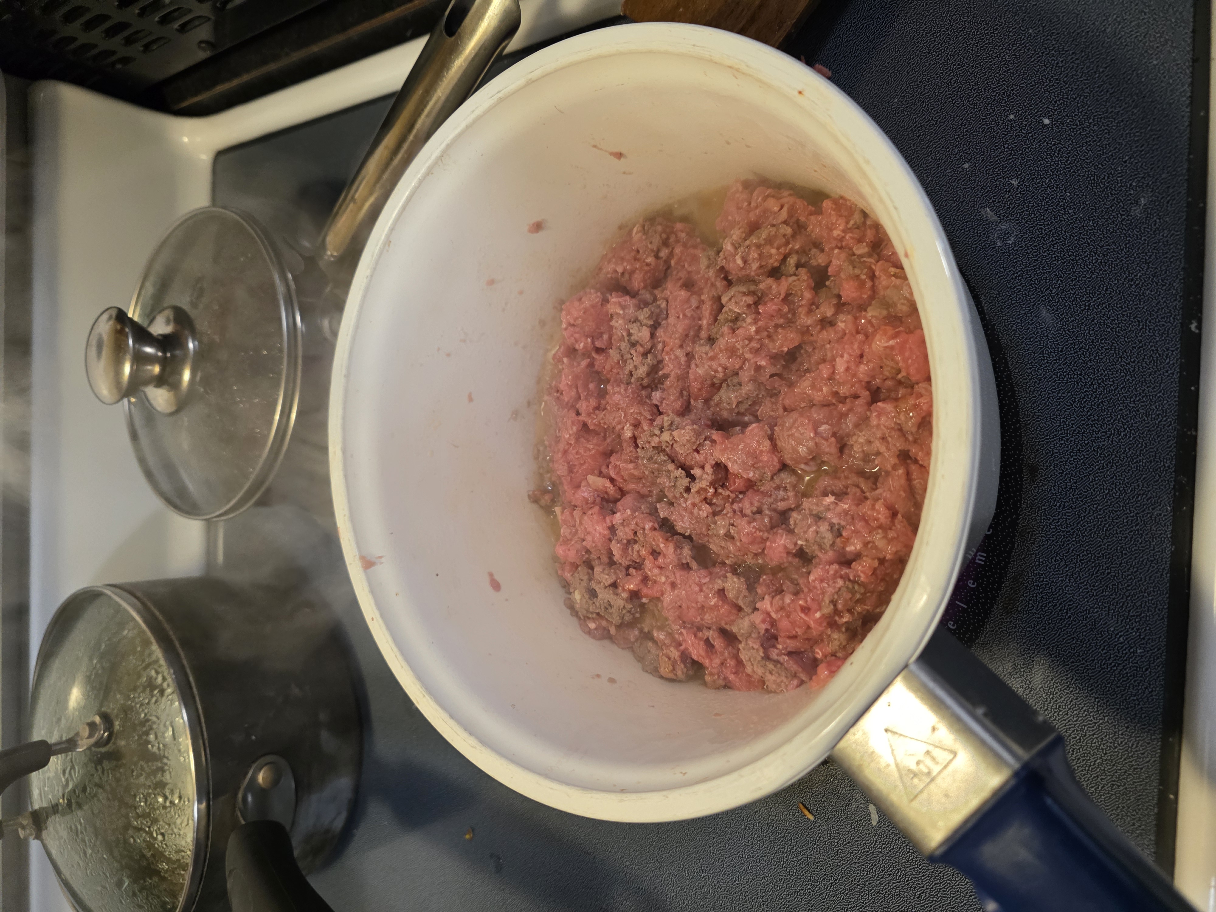 When hot placed the ground beef in the pan and add water.